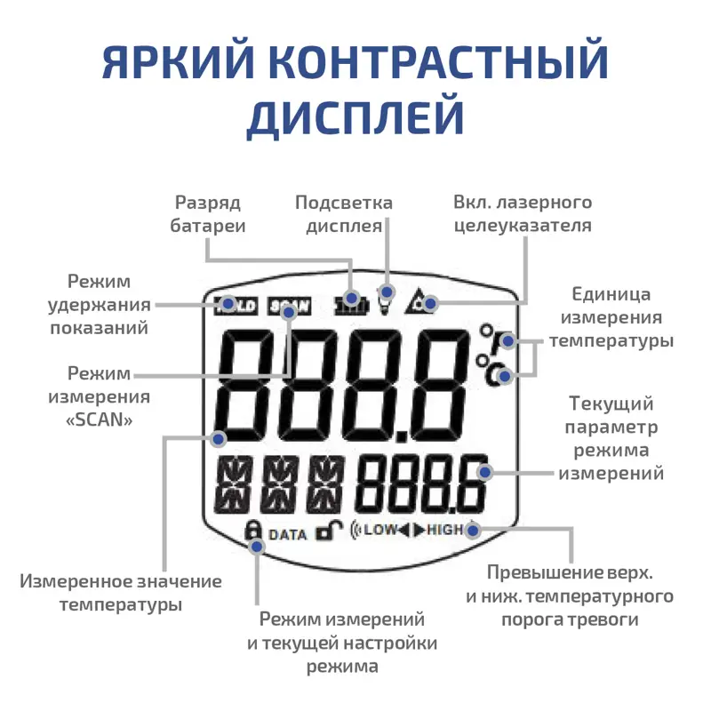 | Режимы отображения температуры | Однократно измеренное значение, значение в режиме непрерывного измерения, максимум, минимум, среднее значение, разница показаний |
