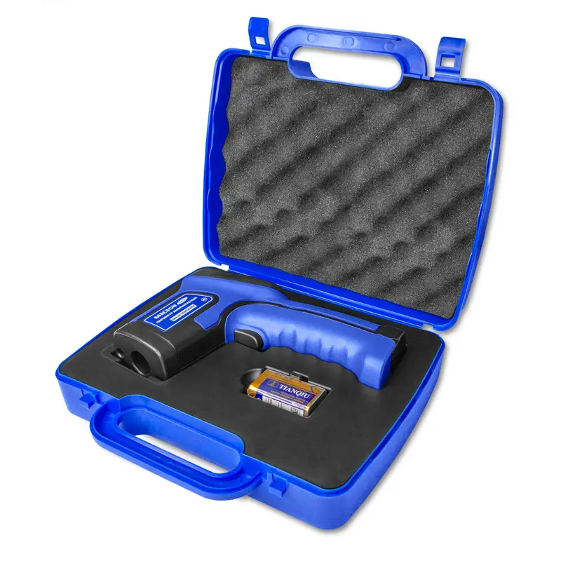Рабочий спектральный диапазон прибора составляет от 8 до 14 микрометров, что соответствует типичному диапазону теплового излучения большинства материалов. Предустановленный коэффициент излучения настраиваемый в диапазоне от 0,1 до 1,0, что оптимально для большинства бытовых и промышленных поверхностей, и избавляет пользователя от необходимости вручную настраивать прибор под разные объекты. Оптическое разрешение 12:1 означает, что с расстояния 12 см можно измерять температуру объекта диаметром 1 см, что повышает точность в работе с мелкими или удалёнными элементами.