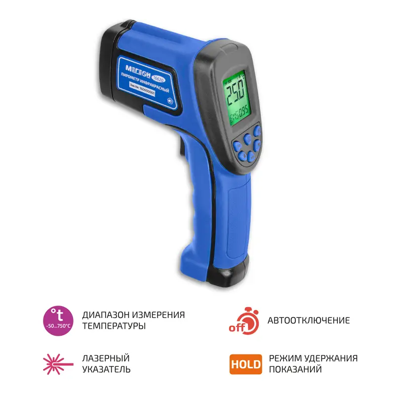 Для удобства пользователя предусмотрена функция автоматического отключения: прибор выключается примерно через 20 секунд бездействия, что помогает экономить заряд батареи. Всё это делает пирометр МЕГЕОН 16620 надёжным и удобным инструментом для точной диагностики температурных режимов без контакта с измеряемой поверхностью.